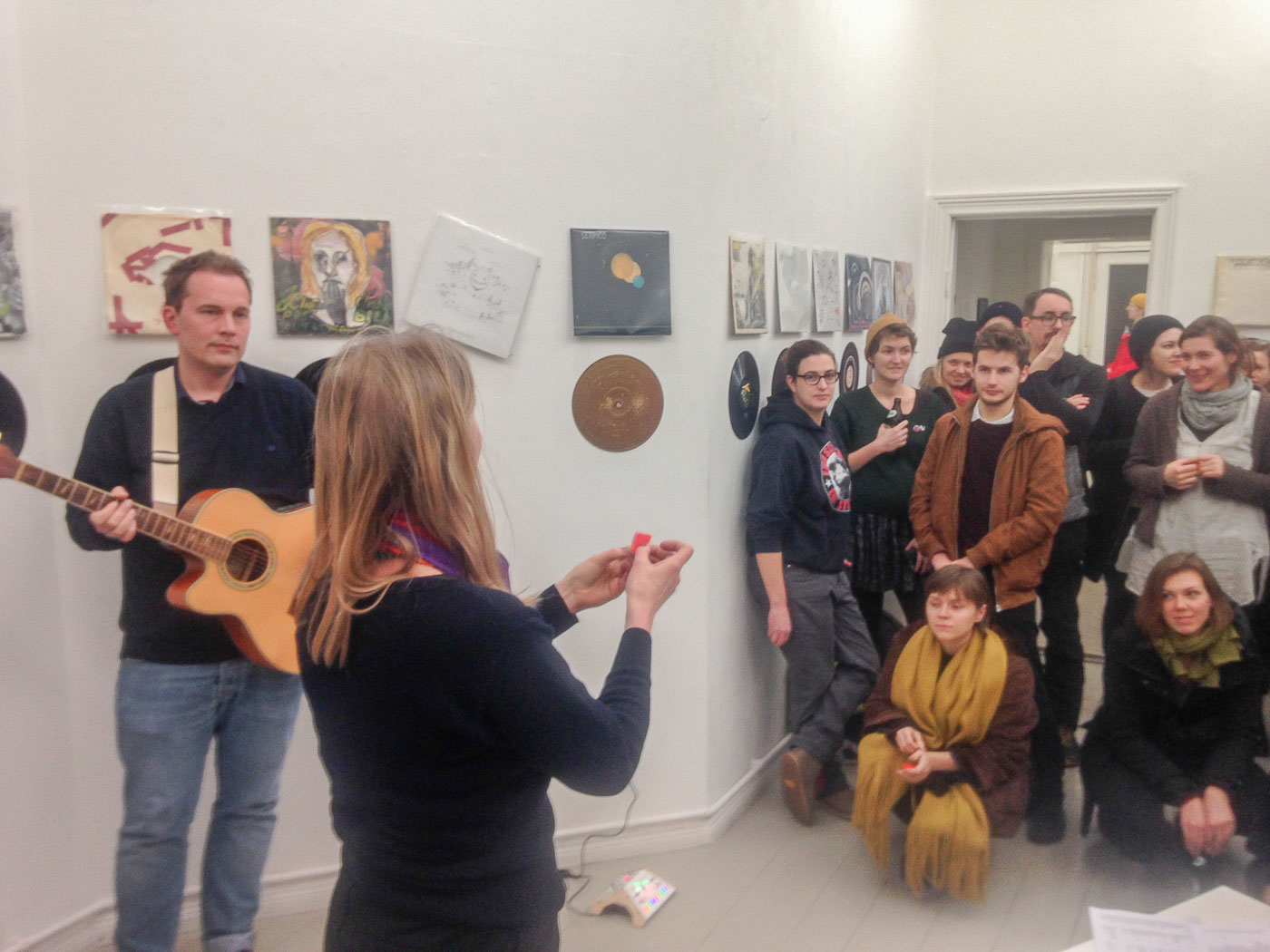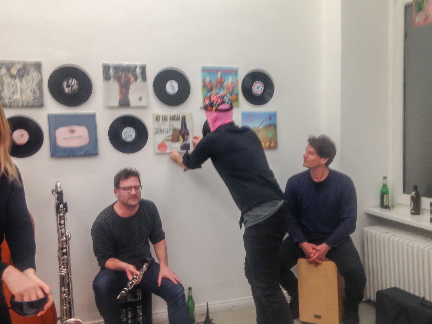 Der letzte Ausstellungsabend wurde von einer Performance gekrönt. Auf Zuruf aus dem Publikum wurden die gefakten Cover live vom Monday Orchestra vertont.